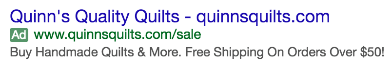 Here’s an example for Quinn’s Quality Quilts. (No, I don’t currently make quilts. But who knows what the future will bring? At least I know what my text ads will look like.)