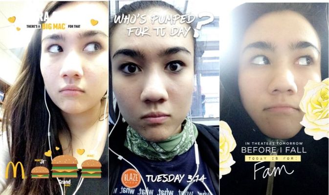 This feature rolled out in 2015. It allows brands to create a filter that users can apply to their own Snapchat. The sponsored filter would pop up depending on location. Brands can use geofilters to promote events, premieres, or stores.